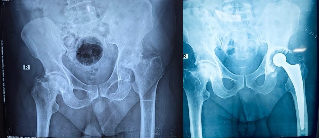 50 years old male, working in Singapore, unable to walk for 6 months. He had a history of motor vehicle accident 12 years back, sustained trauma to his left hip region. Not properly treated. He was managing with very hardship. But gradually he also developed pain in his left hip and both knees. X-ray shows:-